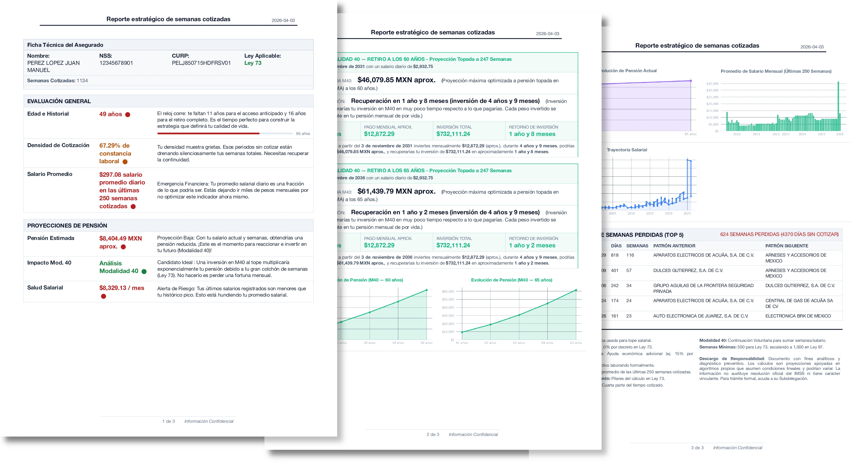 18 de abril, 2026. Sube tu constancia del IMSS y obtén un diagnóstico completo de tu pensión: Modalidad 40, proyecciones a 60 y 65 años, indicadores clave y PDF firmado con código QR.